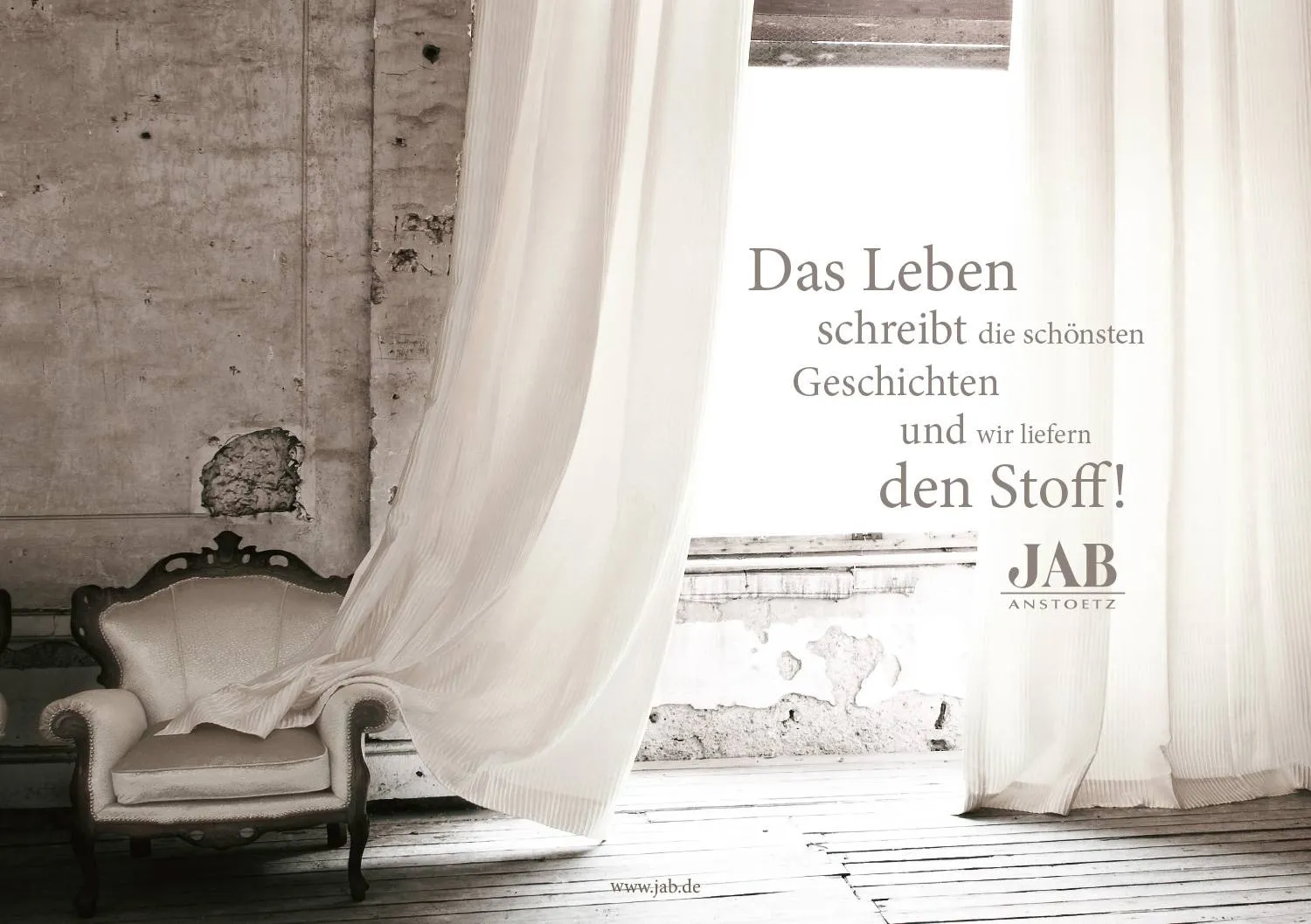 Vorhänge aus edlen Stoffen sind immer noch der dekorativste Licht- und Sichtschutz in den eigenen vier Wänden. Nicht zuletzt sorgen sie auch für ein angenehmes Raumklima und eine bessere Akustik. Zur Förderung des Abverkaufs von ausgesuchten Vorhangstoffen der Marke JAB Anstoetz erfanden wir die „Stoffensive“ und unterstützen den Fachhandel mit zahlreichen Werbemaßnahmen und Werbemitteln. Eines der der schönsten war zweifellos diese Begleitbroschüre.