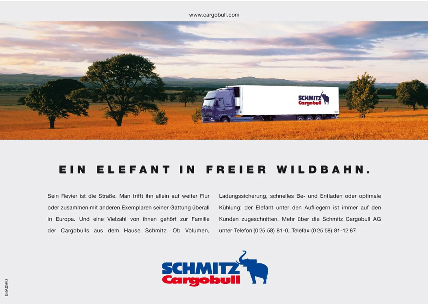 Der Schmitz-Cargobull-Elefant, das Markenzeichen des Marktführers, inspirierte uns zu dieser Imageanzeige für die weltweite Trailer-Company. Das Motiv gehörte zu einer ganzen Serie von Fachanzeigen in allen einschlägigen Branchenblättern des Transport- und Speditionsgewerbes, und blieb immer so etwas wie das Leitmotiv (oder um im Bild zu bleiben: der Leitbulle) der gesamten Kampagne.