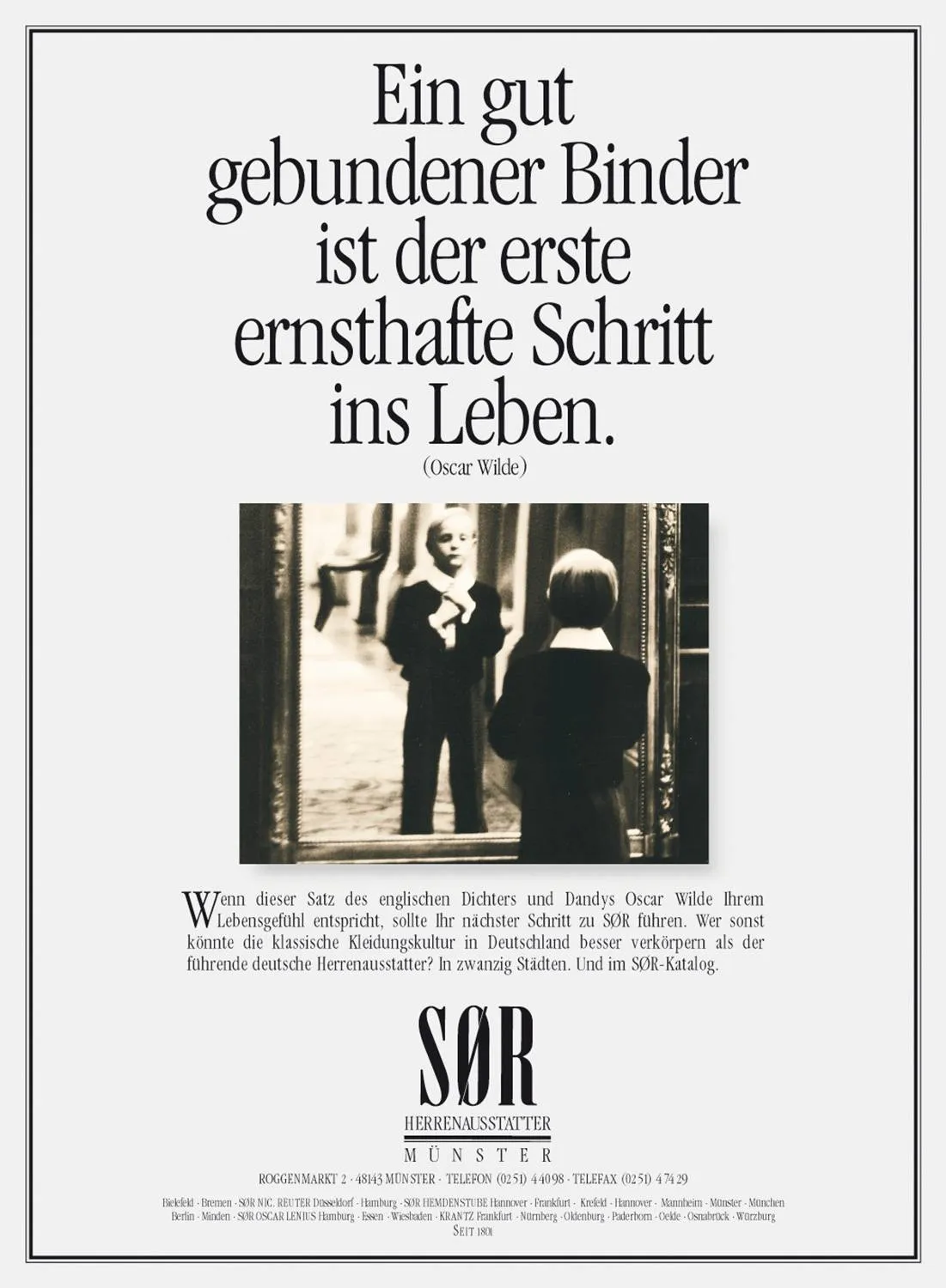 Oscar Wilde gehört zu den wohl meistzitierten Autoren, wenn es darum geht, Stil und Kultur auf humorvolle Weise zu pflegen. Der von uns für den Herrenausstatter SØR gewählte Satz war weitgehend unbekannt, bis wir ihn - mit dem dazu passenden Bildmotiv - in den Stand einer Imageanzeige erhoben. Heute entwickeln junge Männer wieder einen Sinn für die Rituale der klassischen Kleidungskultur. Der doppelte Windsorknoten ist so gesehen geradezu überlebenswichtig geworden.