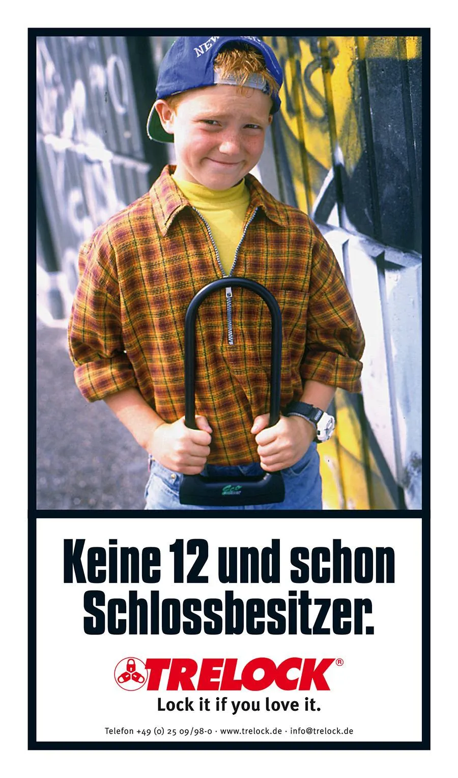 Der stolze „Schlossbesitzer“ war wohl das populärste Motiv einer Kampagne, die Diebe „in Aufbruchstimmung“ verzweifeln ließ, weil die Objekte ihrer Begierde sicher „hinter Schloss und Bügel“ geschützt waren - namentlich: Bügelschlösser von Trelock. „Lock it if you love it“ war der dazu passende Marken-Claim, der sich an Fahrradbesitzer überall in Europa richtete.