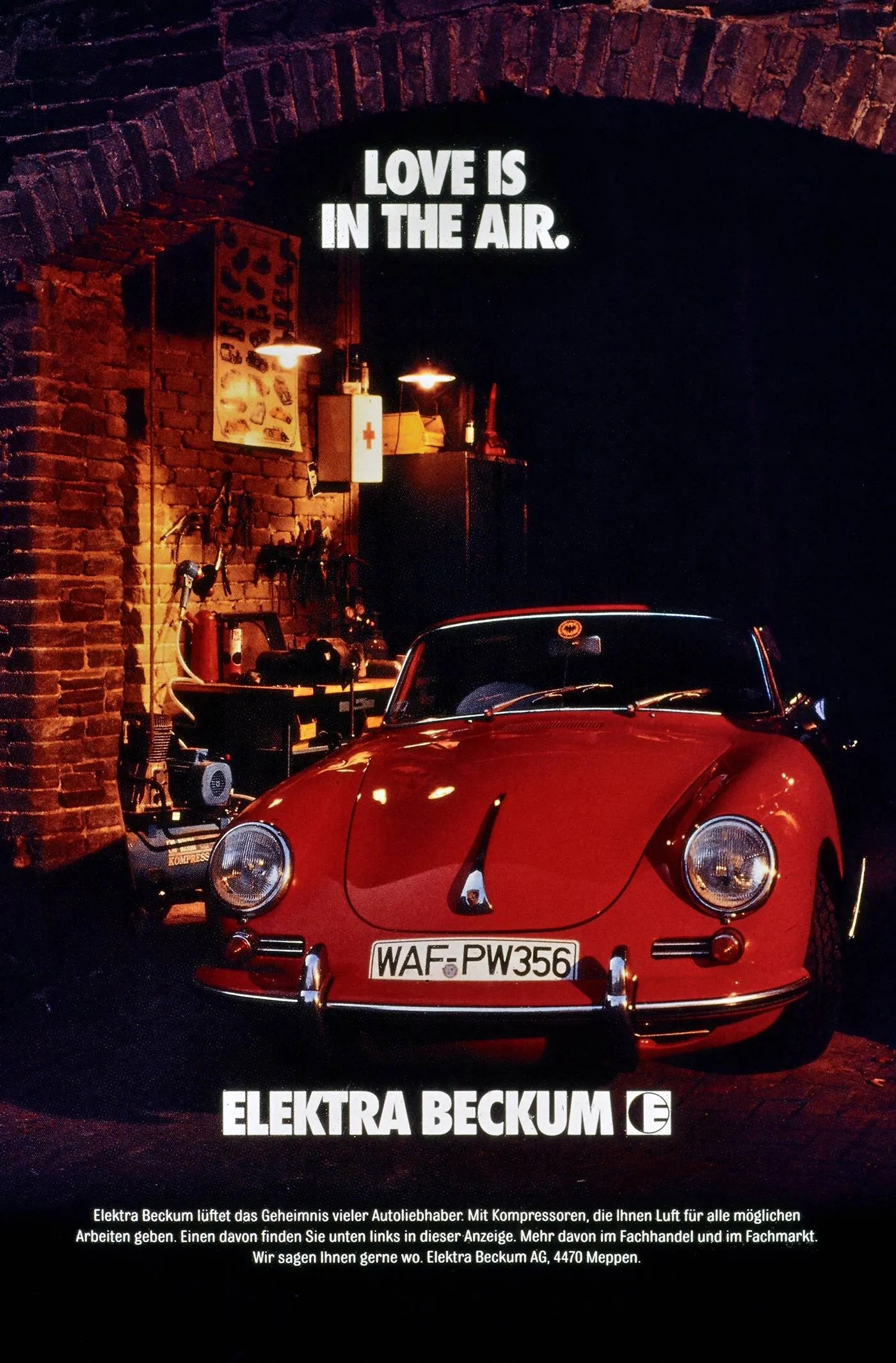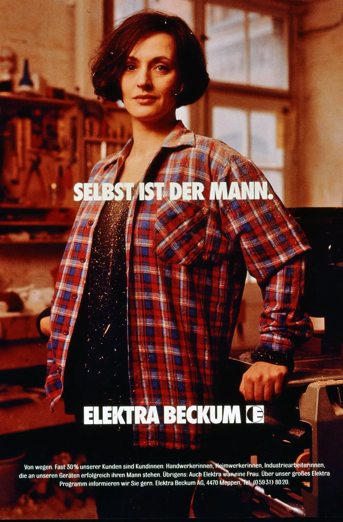 Heute nichts ungewöhnliches mehr: Eine Frau, die ihren Mann steht. (Heute steht die Frau ihre Frau.) In den 90er Jahren des letzten Jahrhunderts sorgte das Anzeigenmotiv „Selbst ist der Mann“, das wir für unseren Kunden Elektra Beckum AG entwickelt haben, aber noch für einiges Aufsehen. - Und mit „Love is in the air“ ist natürlich nicht nur der gleichnamige Hit von J.P. Young gemeint, sondern auch der kleine Kompressor von Elektra Beckum, der die (Druck-) Luft zum Arbeiten liefert ... und keinen Unterschied macht, ob er nun von einem Heimwerker oder einer Heimwerkerin genutzt wird.