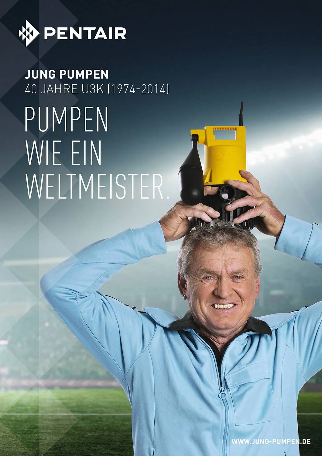 Das Bild hat sich ins kollektive Gedächtnis eingebrannt: Josef „Sepp“ Maier setzt sich nach dem Gewinn der Fußball-Weltmeisterschaft 1974 den WM-Pokal wie eine Krone auf den Kopf. - Genau 40 Jahre später feiert nicht nur die WM ihr Jubiläum, sondern auch die U3K, die meistverkaufte Tauchpumpe von Jung-Pumpen. Was lag da näher als dass sich Sepp Maier ... man muss halt nur drauf kommen. Und den Torhüter, der für jeden Scherz zu haben ist (wenn er wirklich lustig ist), dafür gewinnen. Beides gelang uns. So wurde aus einer Schnapsidee auf der Rückfahrt vom Kunden-Briefing die Jubiläums-Kampagne für die U3K von Jung Pumpen. Mit Sepp Maier als Testimonial.