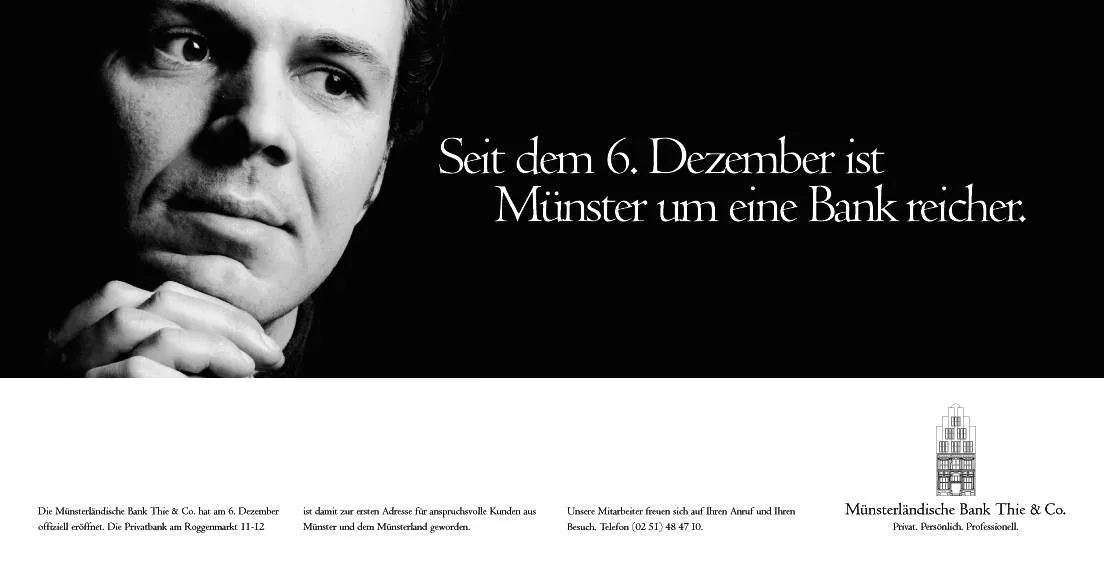 Die Münsterländische Bank Thie & Co. stammt nicht, wie zu erwarten, aus dem westfälischen, sondern aus dem Oldenburger Münsterland. Was lag also näher, als auch in Münster/Westfalen zu gründen. Etwa auf halber Strecke, in Osnabrück, fand sich die Agentur, die der Münsteraner Privatbank ein neues Corporate Design verlieh. Mitsamt Markenslogan und einer Kommunikationskampagne zu Eröffnung: Privat. Persönlich. Professionell.