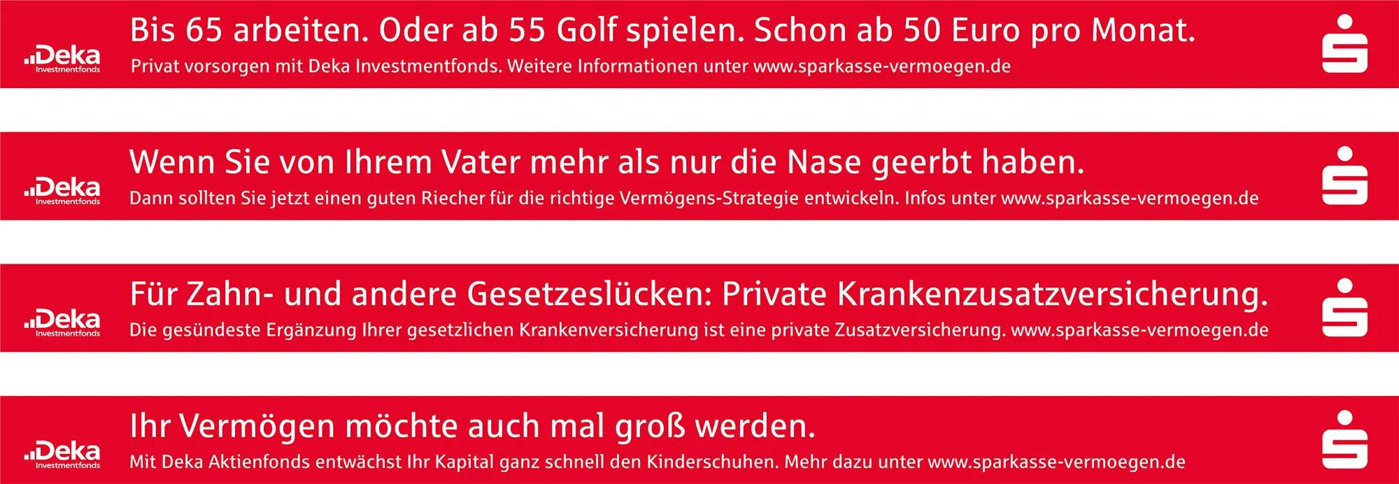 Bei der Sparkasse haben wir einen ganz schönen Streifen mitgemacht. Ein Mal die Woche - immer am gleichen Tag, an der gleichen Stelle - erschienen im Wirtschaftsteil der Tageszeitung, direkt über den Börsennachrichten, diese Streifenanzeigen der Deka Investmentfonds. Am Tag zuvor bekamen wir um 11.00 Uhr das Thema und hatten anschl. bis zum Druckunterlagenschluss um 16.00 Uhr Zeit, uns etwas dazu einfallen zu lassen (inkl. Kundenfreigabe). Es gelang. Viele dutzend Male. Hier unsere vier Lieblingsmotive aus der Kampagne.